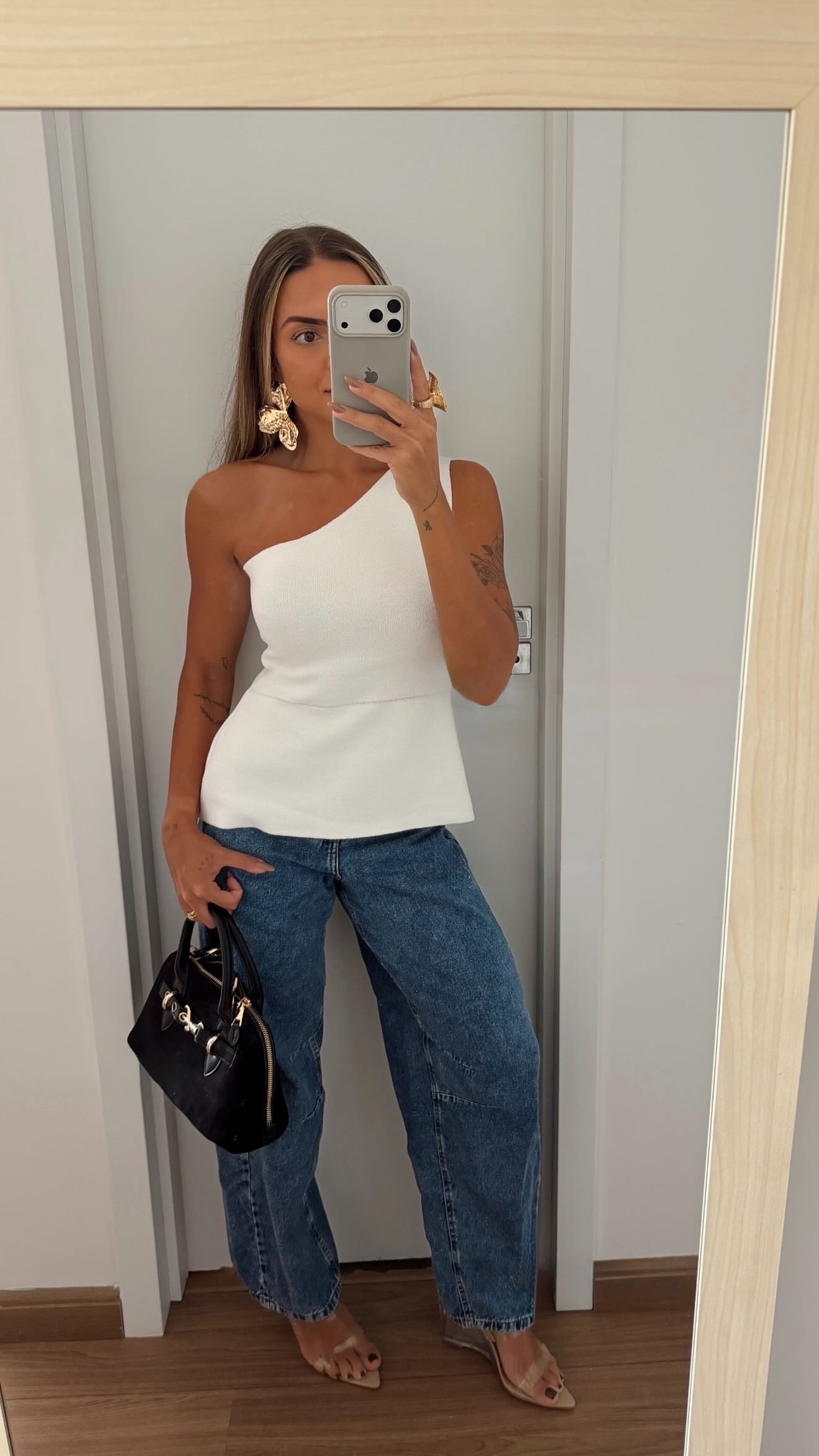 O design de um ombro só traz modernidade, enquanto a cintura marcada com leve peplum cria um caimento elegante e feminino