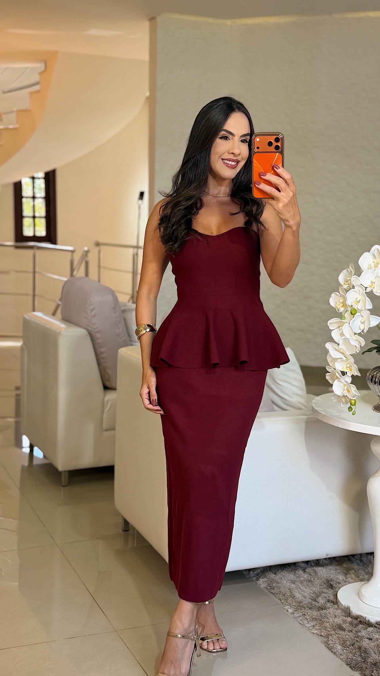 A peça possui modelagem peplum com caimento justo ao busto e solto na cintura