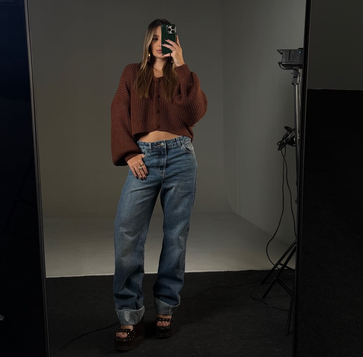 As mangas amplas com punho ajustado adicionam um toque moderno e fashion, equilibrando perfeitamente o visual casual chic