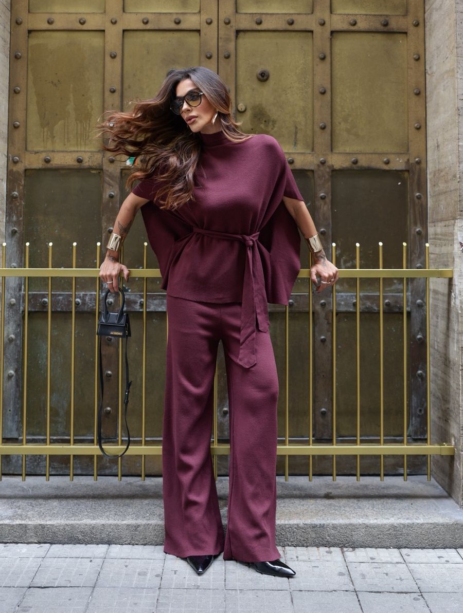 A cor vinho intensa valoriza o look e traz presença para a produção, sendo perfeita para dias mais frios ou para quem gosta de peças elegantes e fáceis de combinar