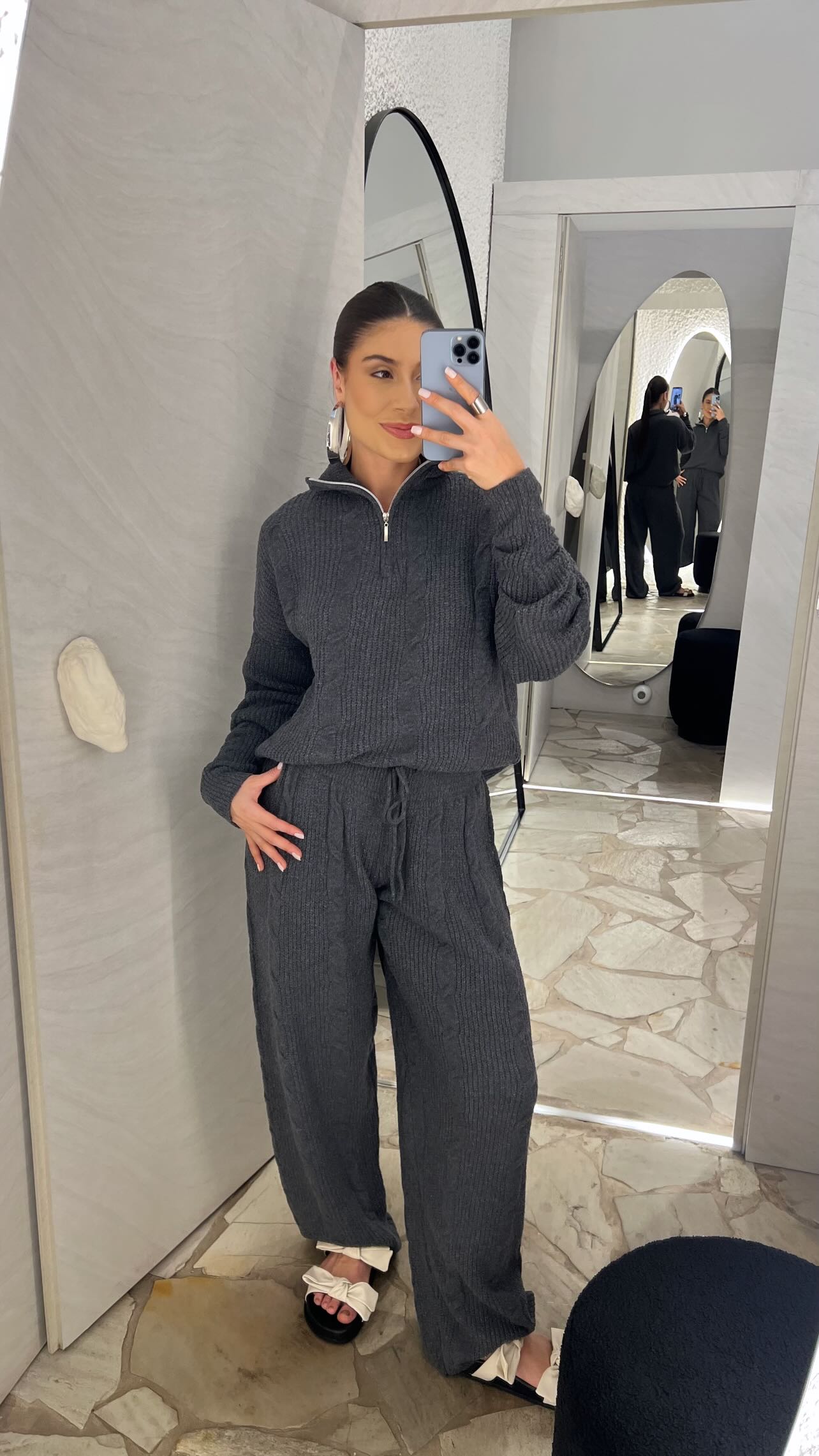 O tom de grafite do conjunto é moderno e atemporal. Ele traz um ar refinado que transforma qualquer produção em algo marcante. O tricot é macio, encorpado e com caimento impecável, modelando o corpo com elegância e sem marcar