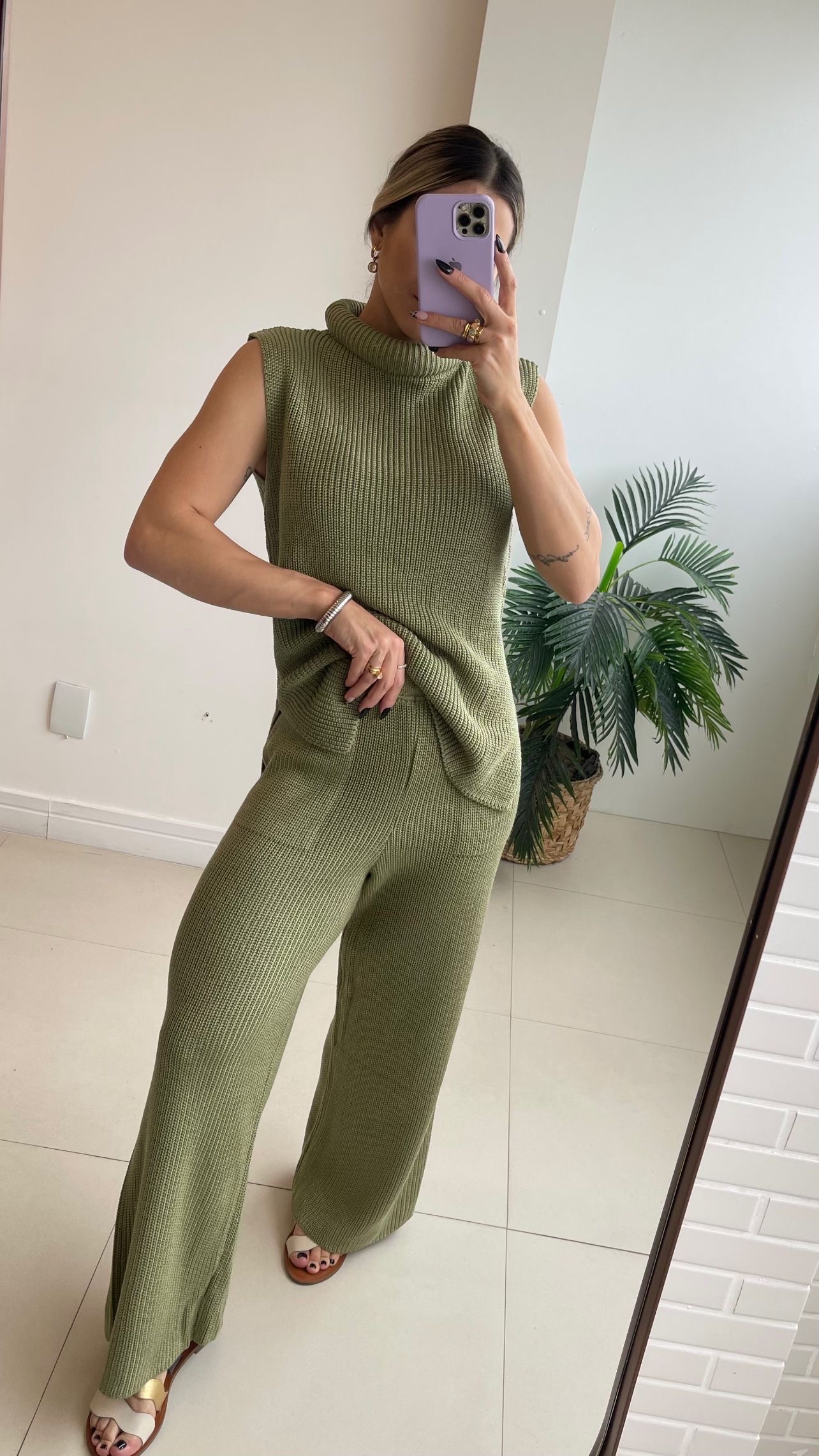 Conjunto na cor verde oliva composto por calça e blusa confeccionados em tricô macio
