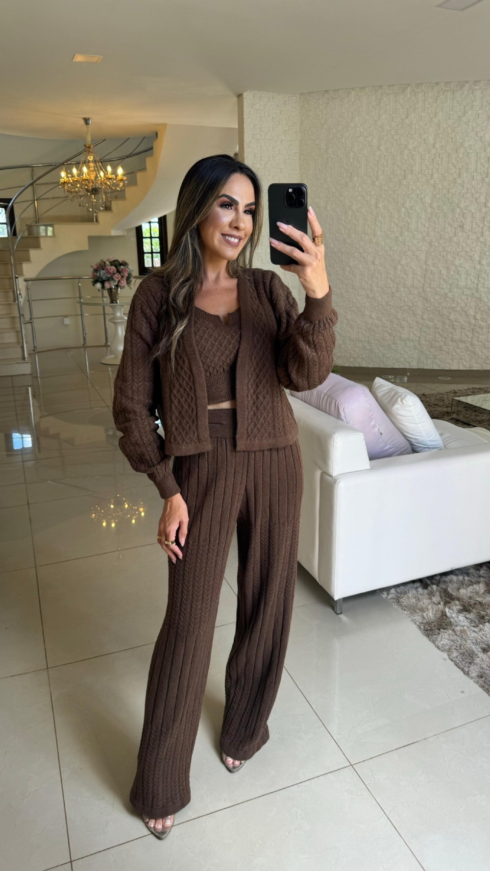 Conjunto na cor marrom escuro composto por calça, casaco e cropped confeccionado em tricô de tramas trabalhadas