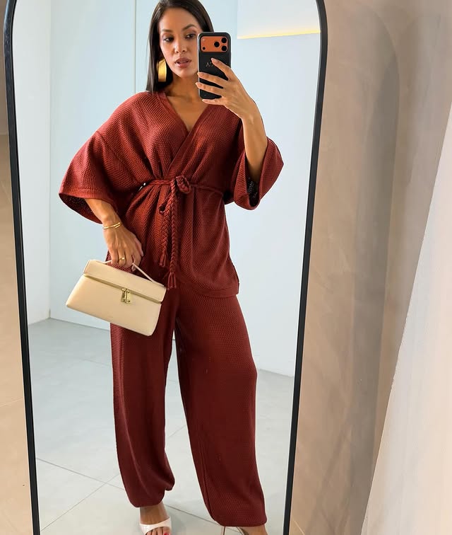 Conjunto composto por calça e kimono na cor marsala confeccionados em tricot
