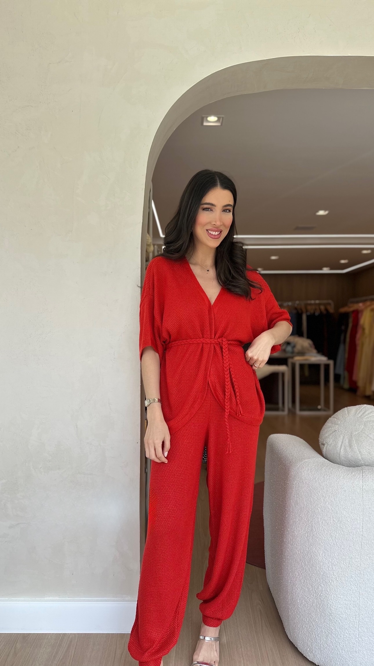 Conjunto composto por calça e kimono na cor vermelha confeccionados em tricot