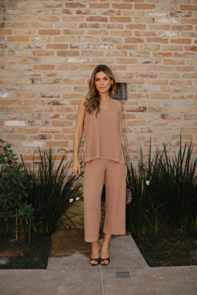 Conjunto composto por calça e regata na cor avelã confeccionados em tricô
