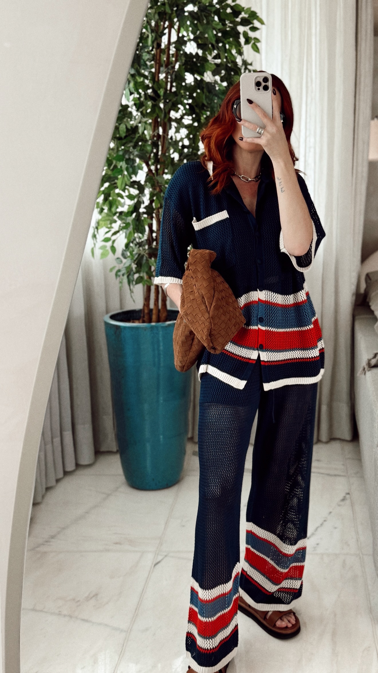 Modelo wide leg com listras nas cores off white e vermelho na barra