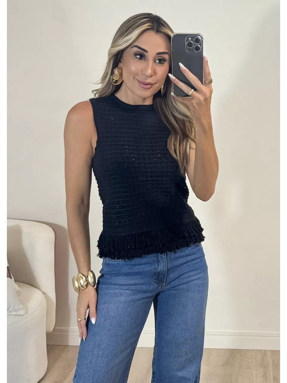 Regata na cor preta confeccionada em tricot de tramas trabalhadas