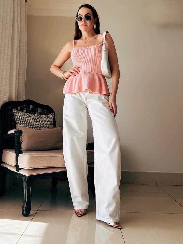 A peça possui modelagem evasê com caimento justo ao busto e solto na cintura