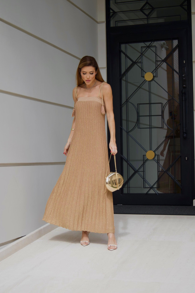 Vestido na cor dourada confeccionado em tricot plissado com fios de lurex